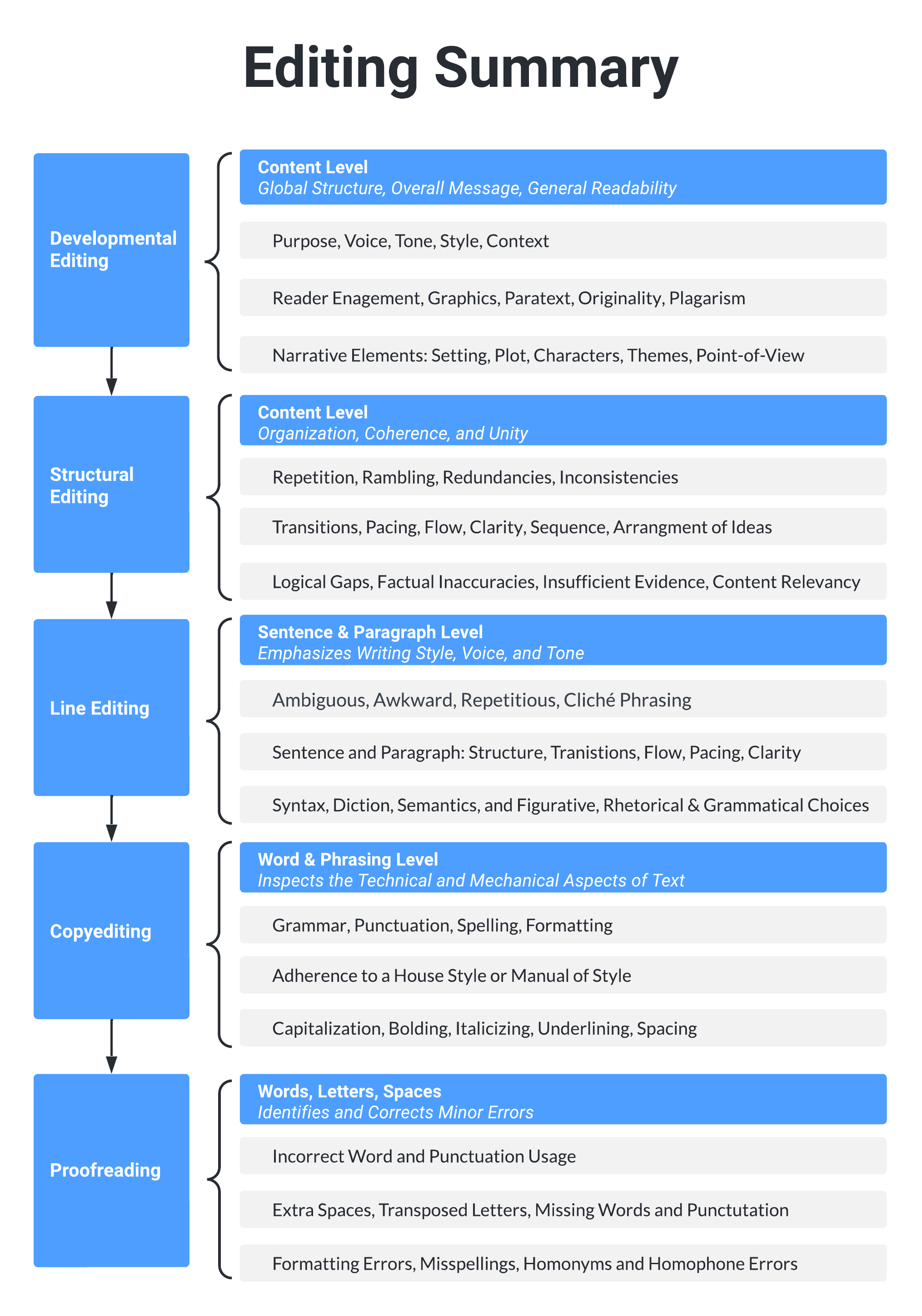 Every writer approaches editing differently. Some copyedit while they write, some jump back and forth between different kinds of editing while creating their initial draft, and some hand over the editing to that friend who loves to edit English papers. There is no right or wrong method. The below editing process is a recommended flow for refining any piece of text before you publish it into a blog post, post it on social media, or turn it into your history professor.